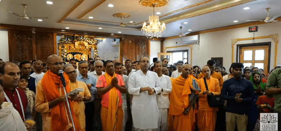 On 7th Dec 2024, devotees at Iskcon Newtown Kolkata celebrated 74th Vyasa Puja of HH Radhanath Swami Maharaj.  Large number of devotees had congregated to celebrate the occasion. A beautiful picture of Maharaj was kept near the altar of Srila Prabhupada. The program began with a video lecture of Maharaj at 8 am after darshan arati and Guru Puja.