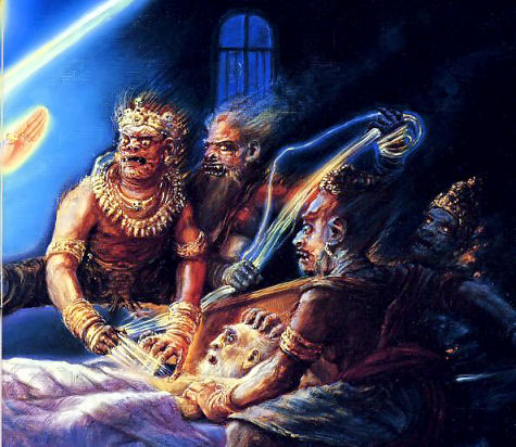 One day somehow both the brahmana and the prostitute died.  So there came the Visnuduttas and Yamaduttas. The brahmana thought that the Visnuduttas have come for him to take him to the kingdom of God but he was surprised to see that the Visnuduttas went towards the house of the prostitute and the Yamaduttas came to him.  Surprised, he asked the Yamaduttas – I was a celibate monk engaged always in worshipping the Lord so the Visnuduttas should have come for me and not you? For what sins I have to be punished?