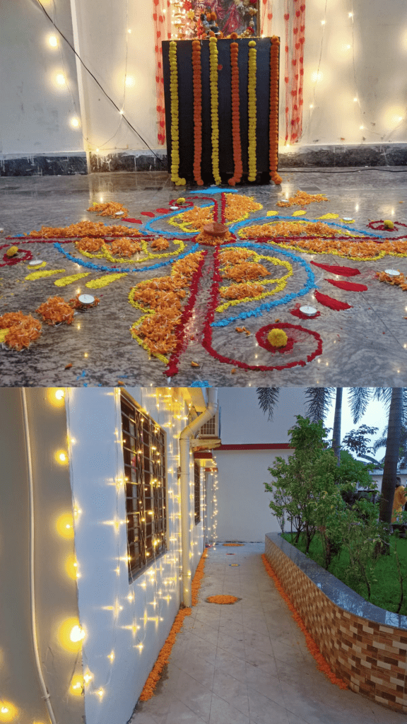 Community hall was beautifully decorated with colourful flowers, balloons, rangolis and lights. At the entrance of the hall rangolis were made with colors and flower petals to welcome the Lord. By evening everything was ready.