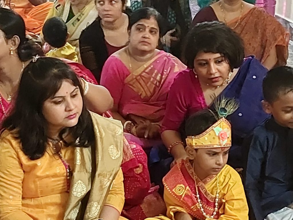 The program was in society’s community hall. On the day of Janmashtami celebration, everyone was busy since afternoon. Some were decorating the hall; some were making sure that all the items are brought from the market. Everyone was engaged.