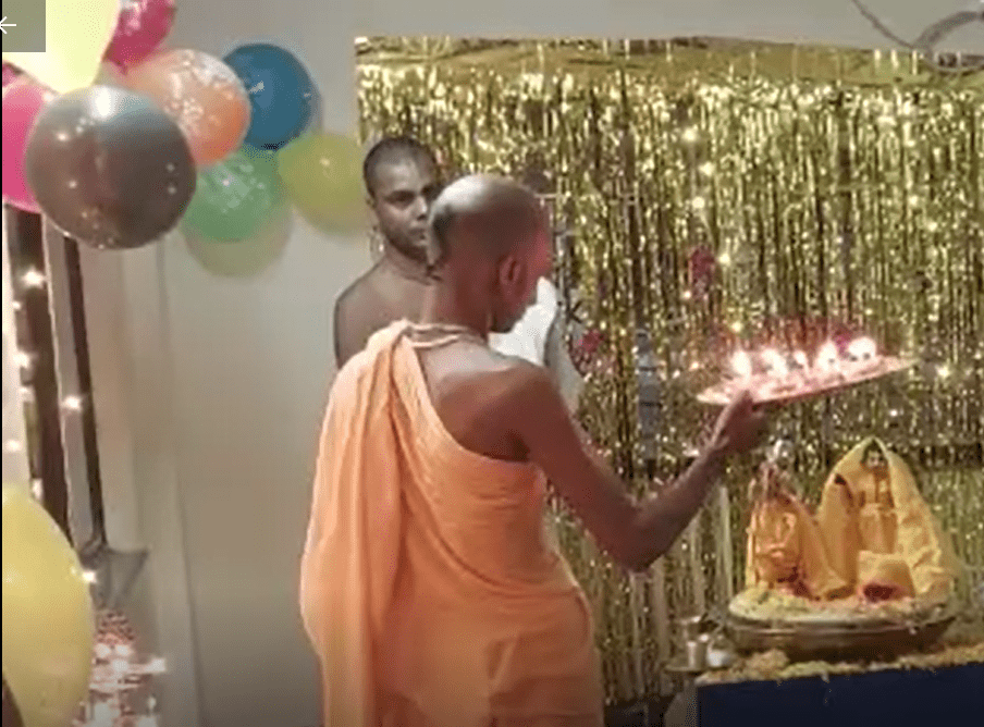 As soon as the deity arrived, everyone started doing kirtan to welcome the Lord. Sri Sri Radha Madhav was placed on a nicely decorated table.