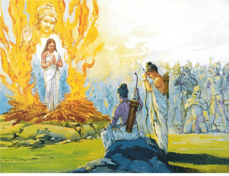 Dasaratha, the father in law of mother Sita, who was then residing in heaven with Indra, seated on a celestial chariot came down and spoke, “Do not think ill of your beloved husband. He put you in a moment of agony to declare to the entire world that you are extremely pure. For eternity your glories will be sung. Your virtue will overshadow the renown of all virtuous lady.” Reference: Ramayana -> Part Three – War – Chapter 14 – Sita’s Ordeal, https://vedabase.io/en/library/rkd/3/14/