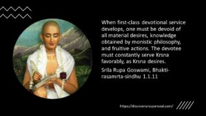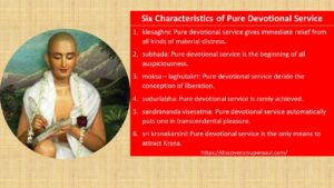 The six characteristics of pure devotional service are: klesaghni: Pure devotional service gives immediate relief from all kinds of material...