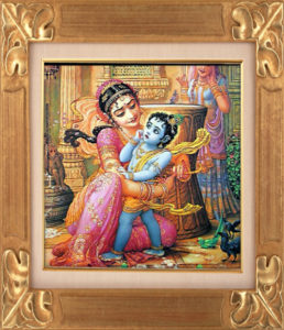 One of the most famous pictures of Krishna is of being bound by mother Yashoda to a grinding motor. When mother Yasoda was trying to tie Krishna every time the rope fell short by two fingers. Scriptures explain that one finger represents our endeavour and other the mercy of Krishna. When Krishna was pleased by his mother’s endeavour he showered his mercy upon her and happily agreed to be bound by his mother’s love.