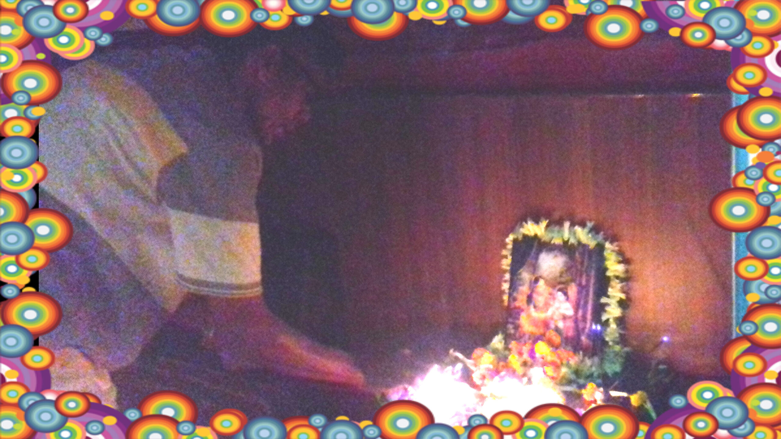 Devotees offer lamp to this picture of Krishna. As the ghee lamp burns our material desires burns and our heart gets illuminated with Krishna’s love.